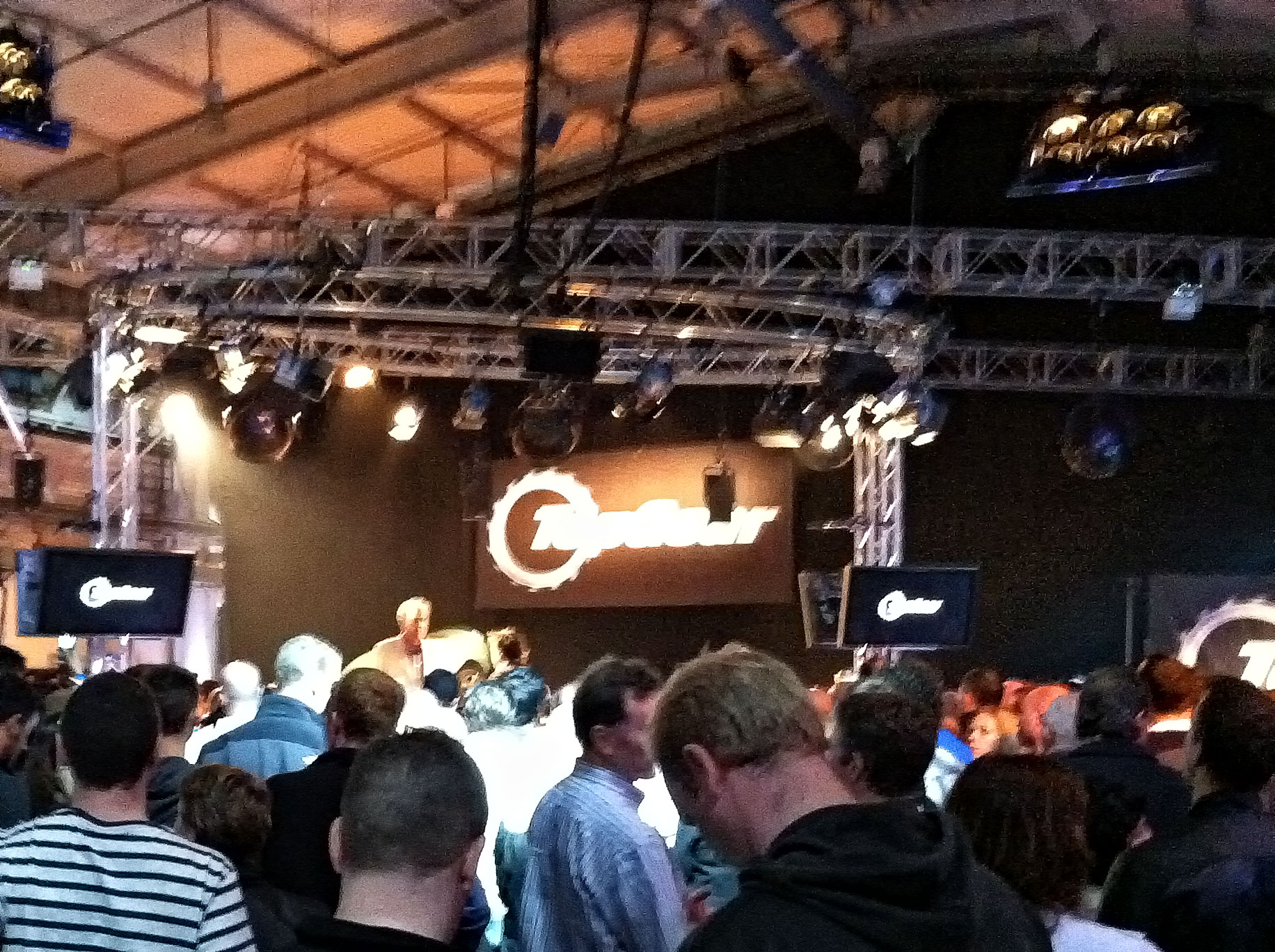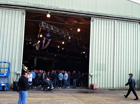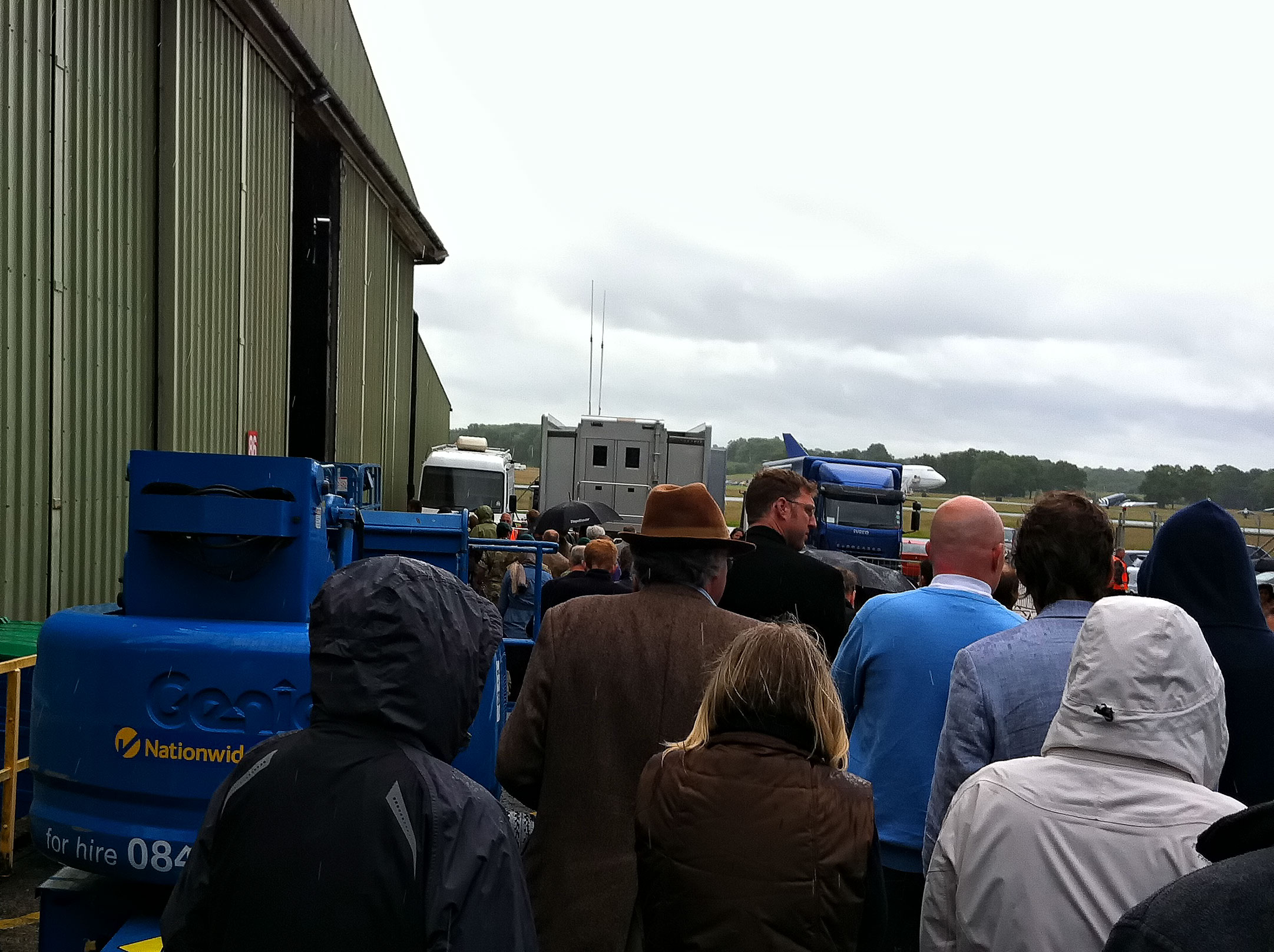 Soon a gentleman appeared and drew us close for initial instructions, asking how many people had NOT seen the show. One out of 850 present. He then announced that we could take cameras into the studio so long as they were smaller and not full SLR sized – totally opposite to our ticket instructions. I had a fully charged iPhone and my Nikon D200 in the boot. Wow! We started migrating away from the car park deeply into the cluster of hangers and other buildings, many of them seeming to have something to do with hopping up cars. The crowd electricity was buzzing and I noticed near us several military and some others with jackets indicating the Royal Navy Parachuting Team. Something was up. We reached a break in the buildings and made a left to see the opening to the studio / hangar with the first people entering.