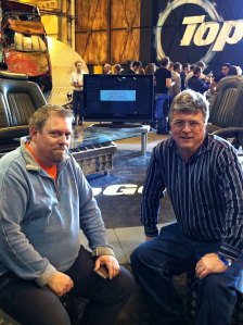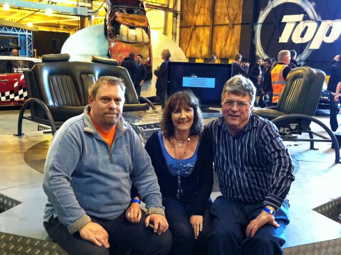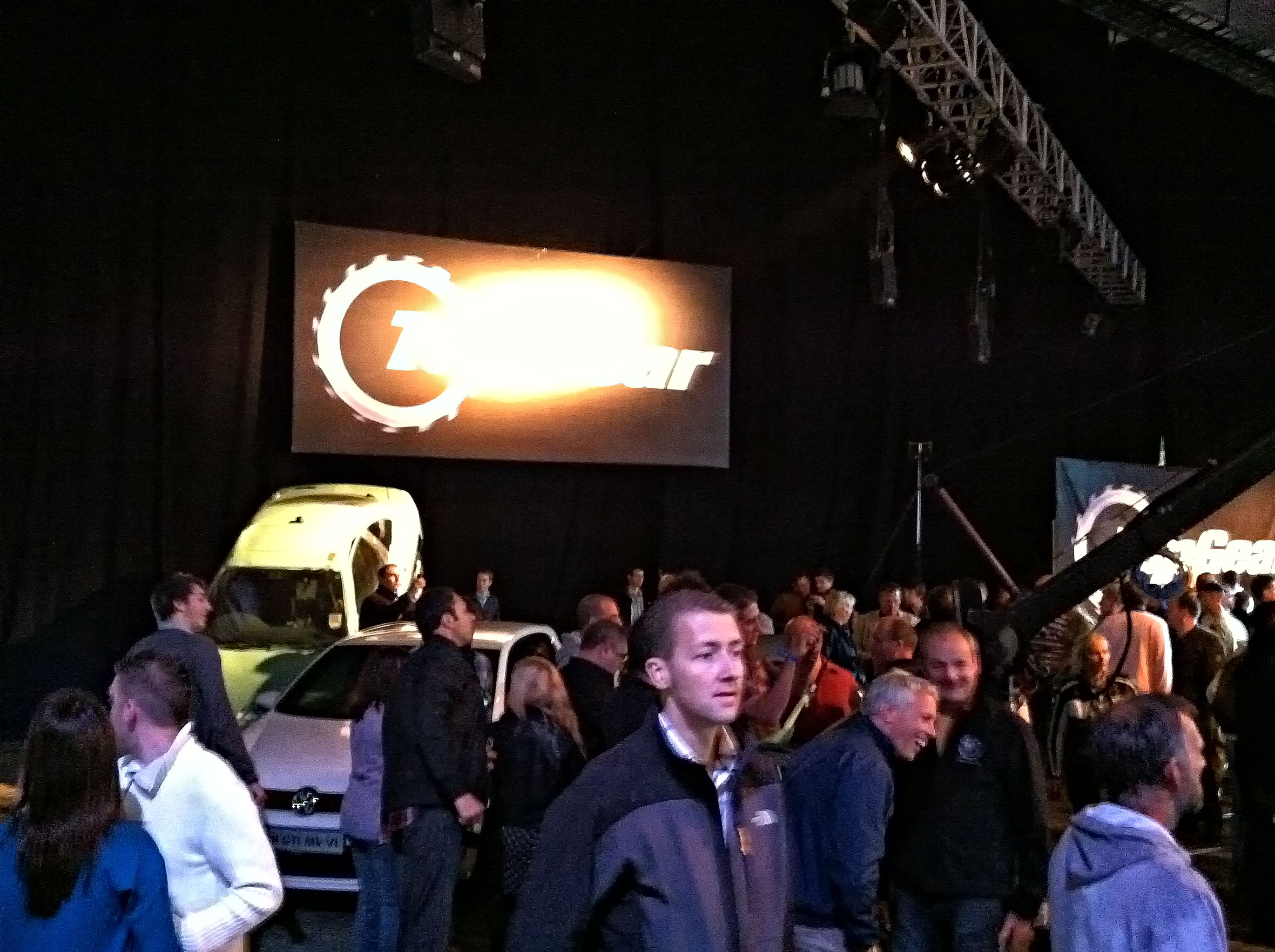 Next, he brought out Richard Hammond and James May and we moved right into taping. There was one boom camera swinging around overhead, two or three cameras on dollies and at least one handheld unit. I remained at the plinth but because tall could see the heads of everyone. There was an audio mike stand not far from where we stood and – as you can tell from the show – there were huge video monitors everywhere to watch the live taping in progress.