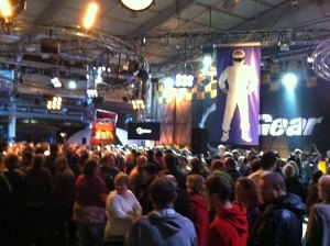 Clarkson on microphone gave a pep talk to these young women to gear them up for the final scene. He addressed them and indicated how important their role to the success of this broadcast was… You see, the primary viewing audience of Top Gear is traveling business men in hotel rooms who are fearful of ordering up the porn channel on the hotel television service because they might get caught, so they instead choose Top Gear and are looking for that same measure of excitement in our show. In that light, these chosen women have a key role in satisfying that key BBC demographic and need to get across the proper impression that will keep this important audience glued to the screen. Actually, Clarkson got a bit more graphic talking about the anatomy of such businessmen but I will spare those details… It was an absolute riot for the crowd.