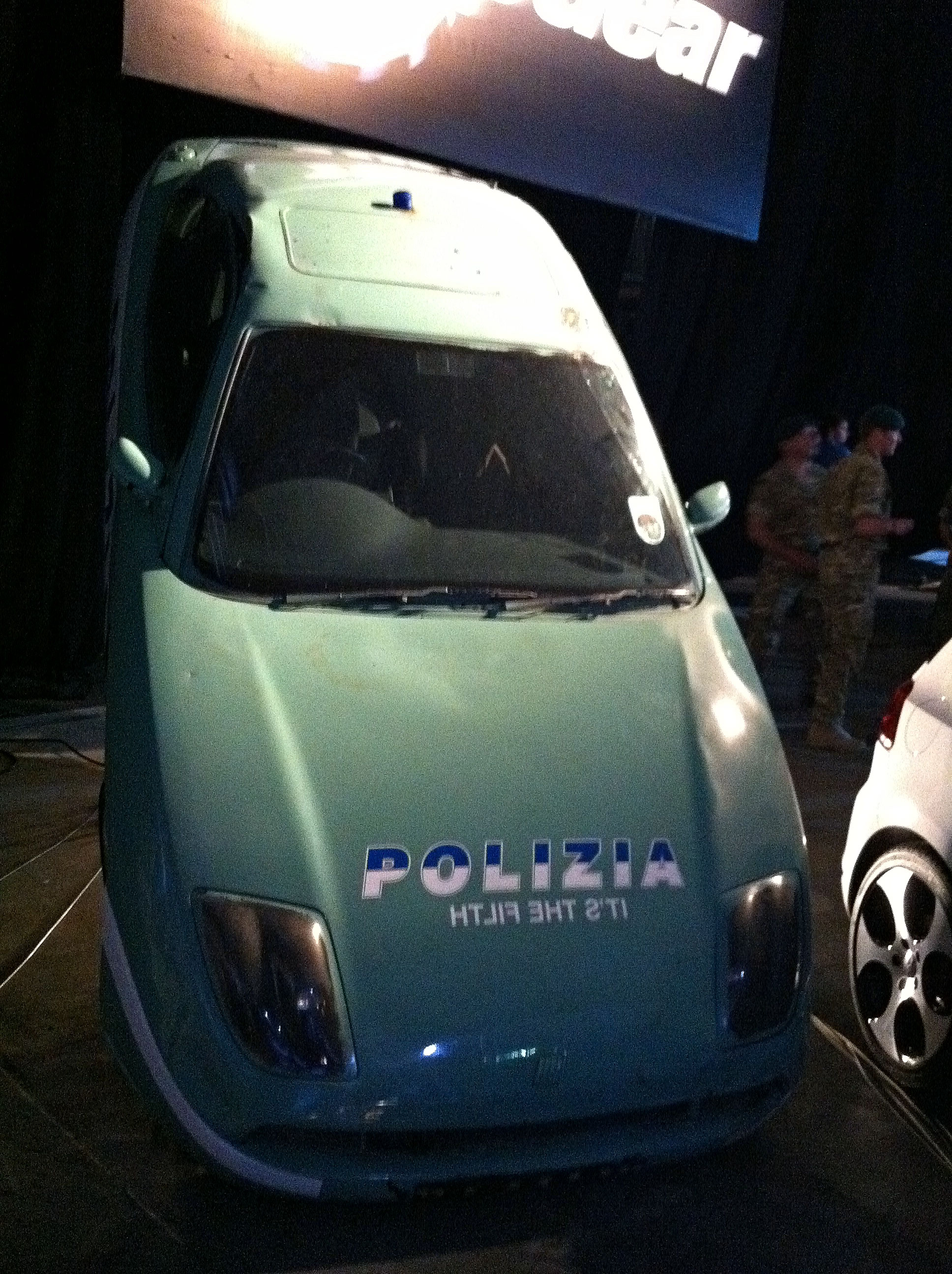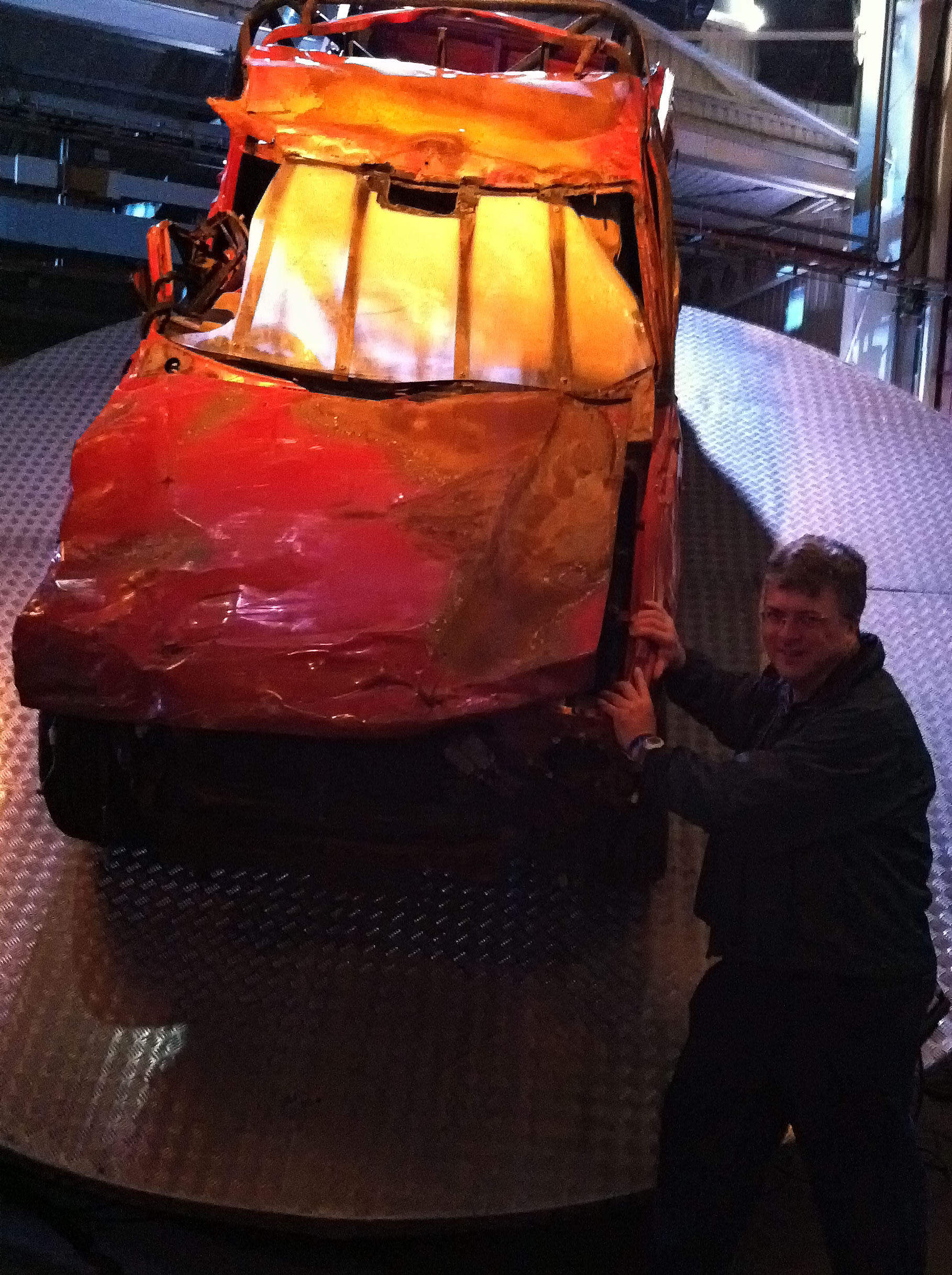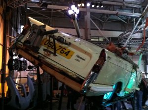 My eyes got used to the dark and after tripping over a wired studio light on the floor (will they throw me out?) and I almost ran into the red Toyota pickup on the plinth. My jaw dropped. I looked around – there was the Cool Wall and there was one of the channel crossing car complete with mast, and over there was the Italian police car (what episode was that again?).