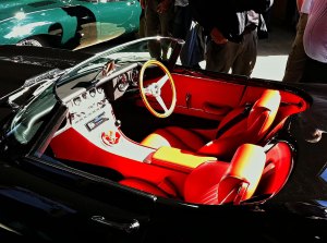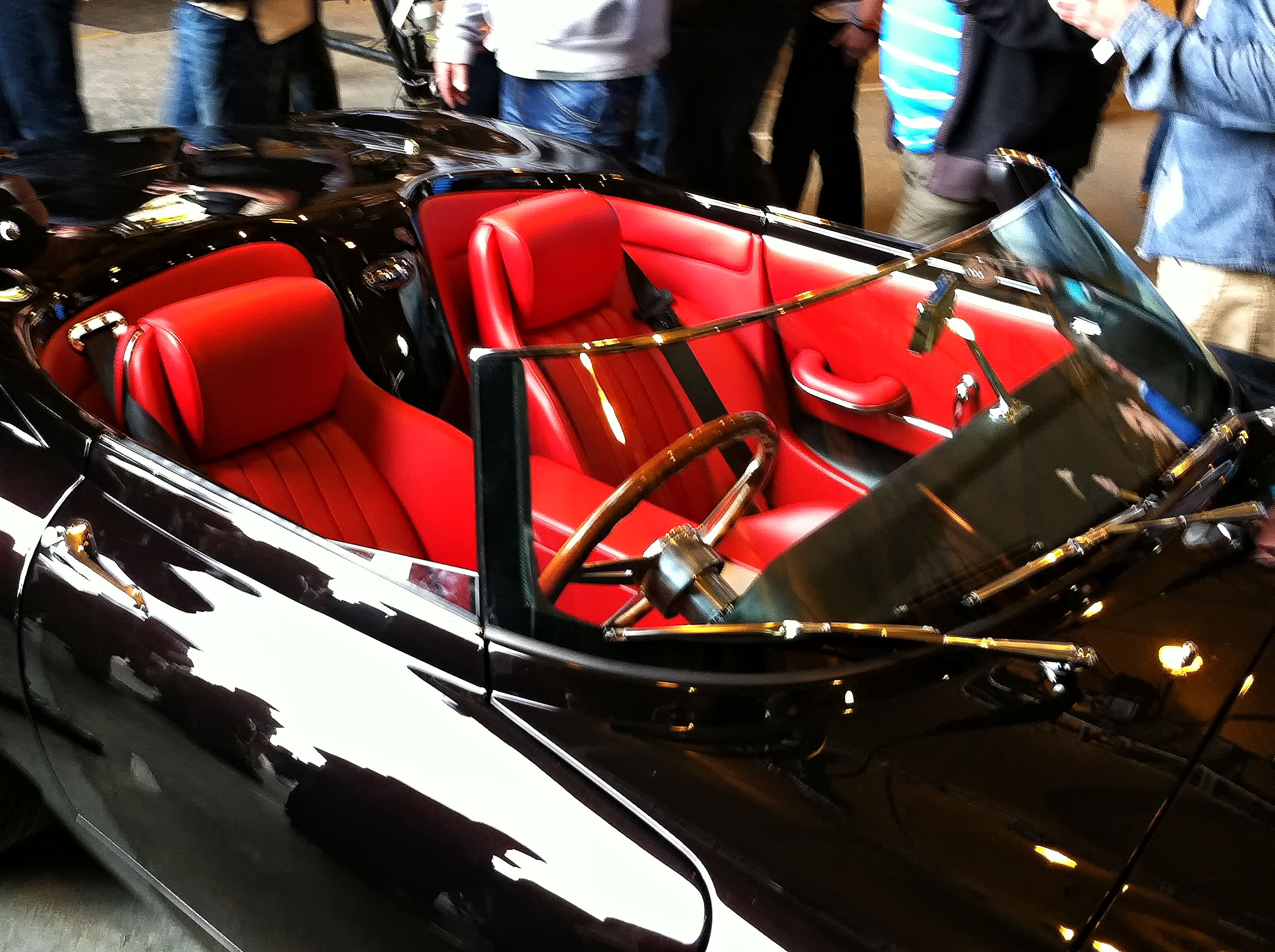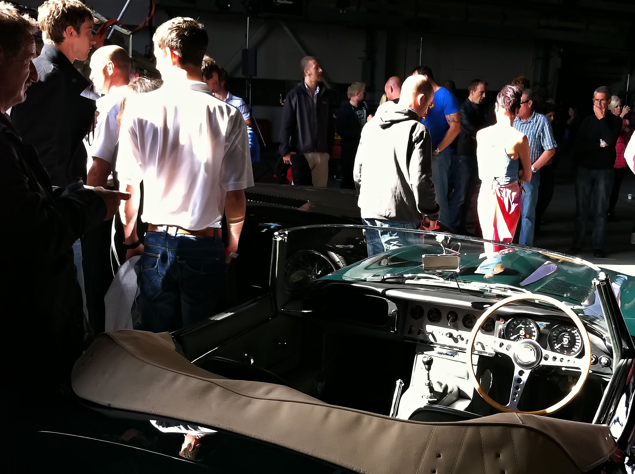 Towards the end of the break, a driver drove a reconstructed modern version of the E Type Jaguar – the Eagle – into the hangar to position it next to the classic E Type Jag. The sound of it was like an acoustic orgasm – and people parted with wonder to let it enter. It looked like an E Type but had radical modern features like a cockpit sculpted in red with no convertible top – it was a permanently open car. The lines were familiar but modern and radical. It was fun to be in the presence of a GBP 600,000 car and to be able to touch and photograph it. After this, people began to cluster around the Jags in large number but the producer advised that we wouldn’t be doing that segment for a while. Still, I wanted my position next to the E Type Jag but found that a number of English 20 somethings had grabbed that ground. I positioned myself next to them and inched my way every moment more and more towards the car until I was front row.
