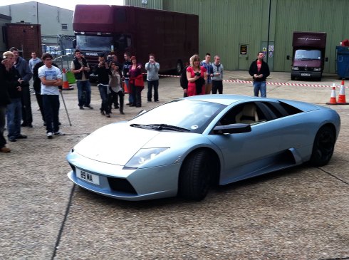 It was finally a wrap and the production crew began to stand down – but I still had something fun to witness. I was standing outside the hangar doors and an insanely beautiful Lamborghini started driving straight towards me. I moved out of the way and it slowed and stopped. I was to understand that this was Hammond’s car for the ride home. It was just amazing. Jezza complained all he had was a Golf to go home in.