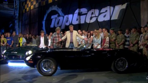After the MINI segment, the producers began to set up for the final Jaguar segment and by this time I was front row leaning next to the classic Jag E type right abreast of its windscreen. I was hopeful for my two or three seconds of fame to be sure. The three presenters gathered between the two Jags with the Royal Navy Parachute Team arrayed behind them. It was at this point that I witnessed the phenomena I was sure happened at each and every taping of the show since the beginning – the “stage dressing” of the pretty young things that always appear behind the presenters. The crew had found three or four gorgeous young women and brought them out stage center behind Clarkson, May and Hammond – positioning them in clear sight to cover most of the background behind them. They even made sure that one surly looking gearhead was positioned right behind Clarkson and out of view. What happened next was a hoot.